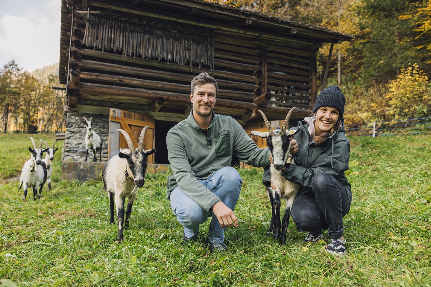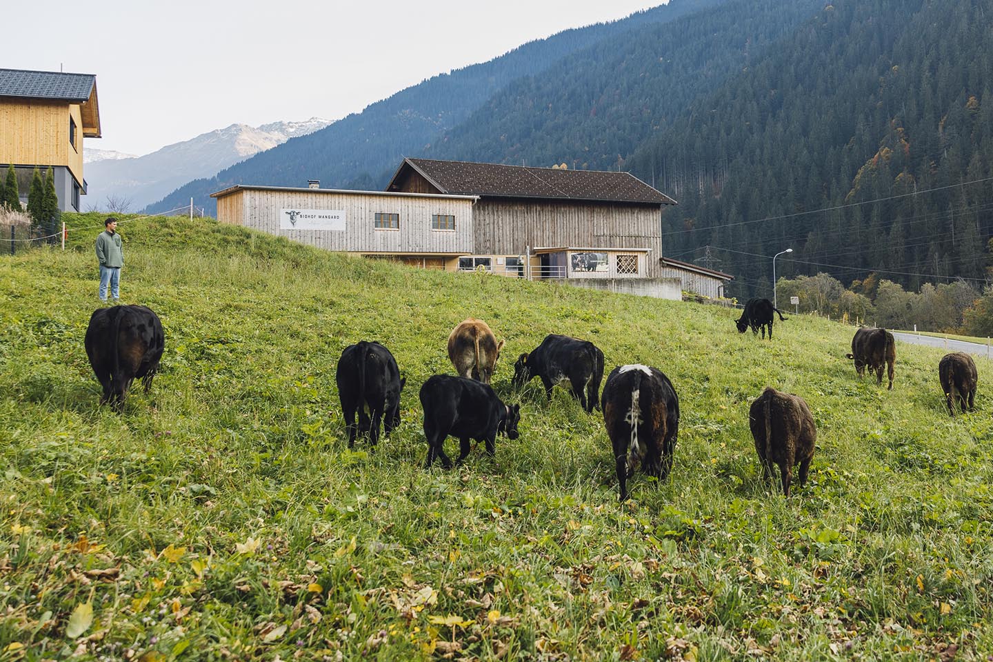 Rund 15 bis 20 Rinder sind es, die je nach Jahreszeit am Hof, auf dem Maisäß oder auf der Alp leben und mindestens ein Alter von drei Jahren erreichen. In dieser Zeitspanne fehlt es den Tieren an nichts. „Wir wissen, dass die Tiere uns ihre ganze Lebenszeit begleiten und dass sie unser Engagement und unsere Fürsorge verdienen.“ Zu den mächtigen, bulligen Tieren kommen noch ein paar Pfauenziegen, um die sich vor allem seine um zwei Jahre jüngere Lebensgefährtin kümmert. Nach der Geburt des gemeinsamen Sohnes Oskar vor vier Monaten ist Victoria – sie arbeitet in der Pension Faneskla im Silbertal die ihrer Mutter Barbara führt – derzeit in Karenz.