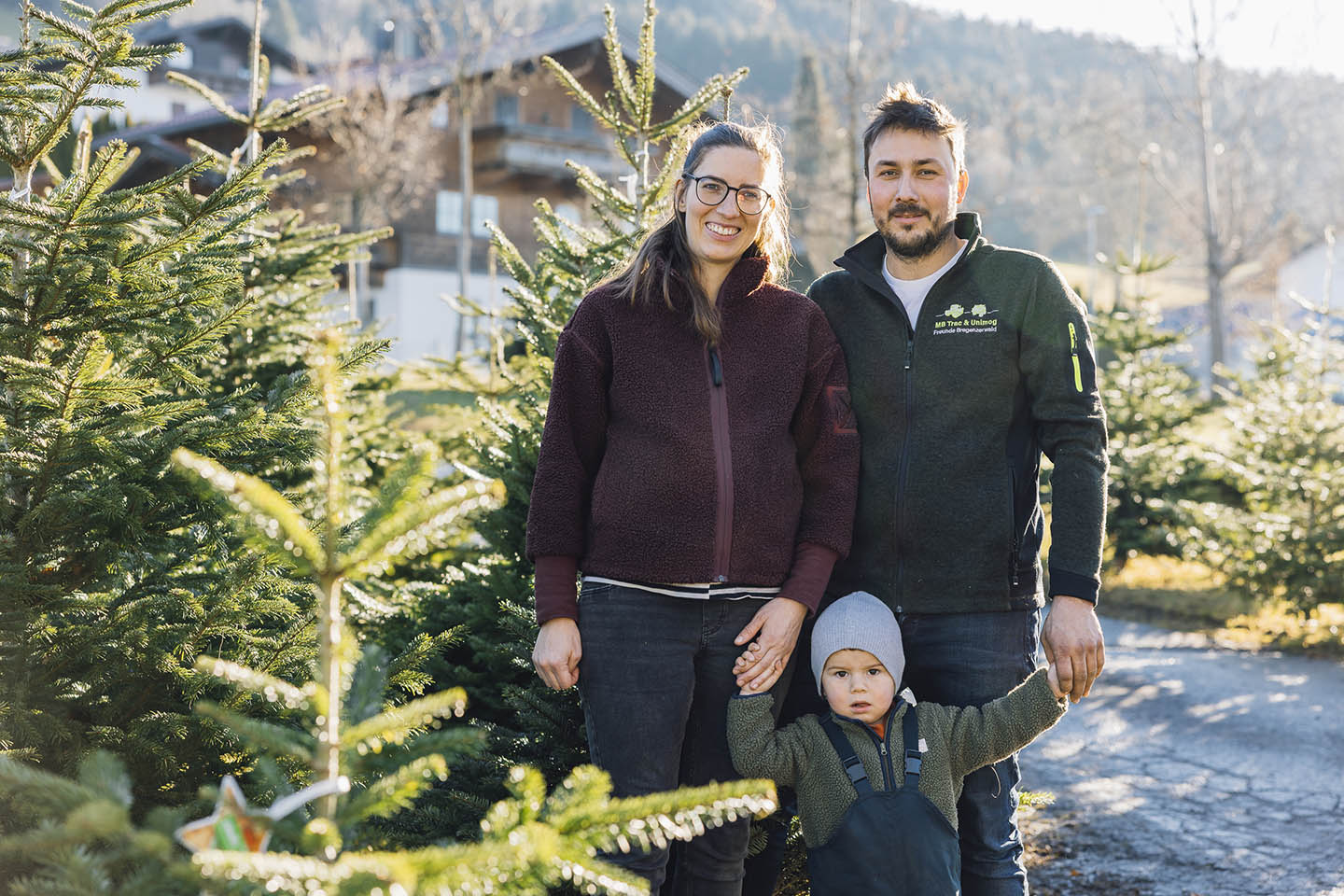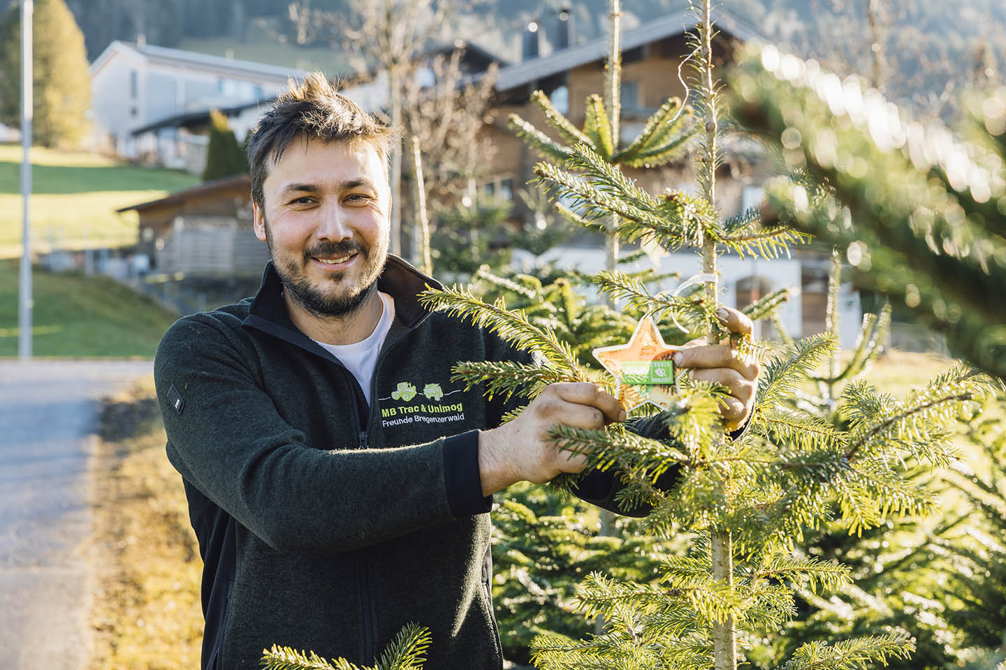 Gmeiner Laurin Steht Neben Neben Einen Ländle Christbaum Und Hält Den Stern Mit Gütesiegel In Die Kamera.