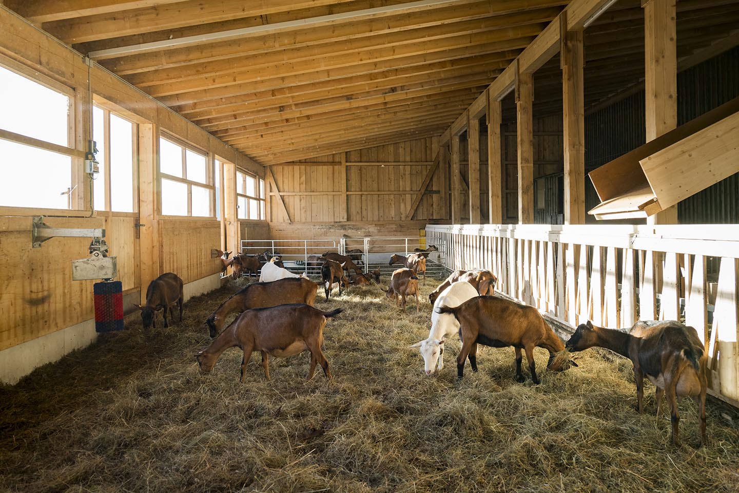 Der 36-Jährige ist das Alpleben von Kindesbeinen an gewohnt. Er war es auch, der mit den Ziegen begonnen hat. Im Alter von zwölf Jahren bekam er die erste geschenkt. Nun sind es rund drei Dutzend der Rassen weiße Saanenziege, Gämsfarbige Gebirgsziege und Bunte Edelziege. Als universelles Nutztier ist die Ziege Milch- und Fleischlieferant gleichermaßen und leistet auch in der Landschaftspflege unersetzbare Dienste. Ziegen weiden auf ganz steilen Hängen, während Kühe auf anderen Weideflächen grasen. „Für uns ist dies deshalb eine ideale Kombination“, erklären die beiden. Für das Melken der Ziegen, das zweimal pro Tag erfolgt, ist Kerstin zuständig. Rund drei bis vier Liter Milch gibt eine Geiß täglich, wobei die Tiere durchaus auch ihre Launen haben. Nicht umsonst spricht man umgangssprachlich von „zickig sein“. Nur gut, dass sie auf der Sonnenseite am Hof in Hittisau-Bolgenach leben, der auf direktem Wege ins Lecknertal liegt. Bereits vor 25 Jahren errichteten Klaus und Mina Schwarz einen 420 Quadratmeter großen Laufstall für die Kühe – es war der erste in der Gegend. Vor fünf Jahren wurde dann der Ziegenstall erneuert, der nun nochmals vergrößert und mit mehr Komfort versehen wurde. Kerstin Schwarz, die sich selbst als „Geißen-Heidi“ bezeichnet, schaut mehrmals am Tag nach dem Wohlergehen der Ziegen.
