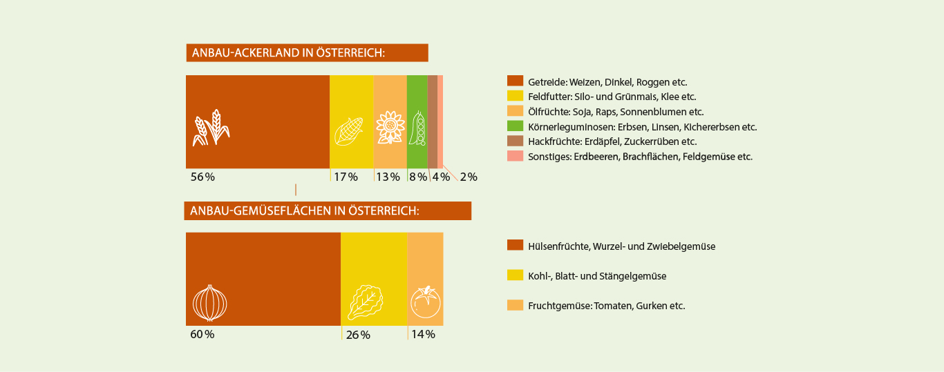 Vorarlberg nutzt von seiner gesamten landwirtschaftliche Fläche nur rund 3,5 Prozent für den Ackerbau, Niederösterreich dagegen rund 77 Prozent. Neben dem Ackerbau kann der Pflanzenanbau für Lebensmittel noch in Gemüse-, Obst- und Weinanbau unterschieden werden. Österreichs Ackerbäuerinnen und -bauern befolgen im weltweiten Vergleich strenge Pflanzenschutz- und Dünge-Richtlinien. Häufigere Extremwetterereignisse, vermehrter Schädlingsdruck und steigende gesellschaftliche Anforderungen sind nur einige der aktuellen Herausforderungen für Österreichs Ackerbaubetriebe.