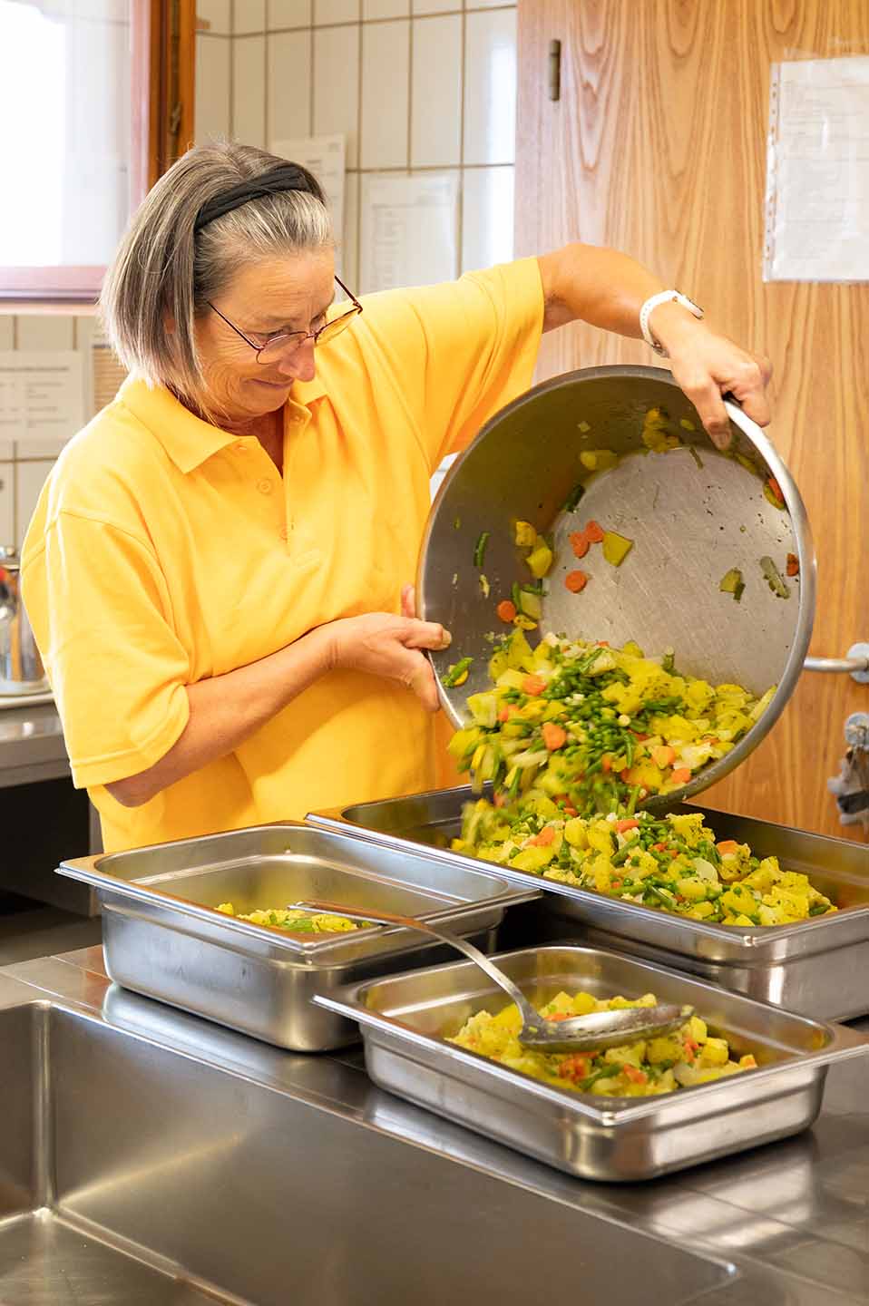 Im Pflegewohnheim Sulzberg werden bis zu 95 Mahlzeiten pro Tag zubereitet. Von Montag bis Donnerstag wird für die ganz Kleinen aus dem Spielhüsle sowie den Kindergärten mitgekocht, am Montag und Dienstag noch zusätzlich für die Volksschulkinder aus Sulzberg. Dazu wird auch für das Personal des Pflegewohnheims, für Betreutes Wohnen Haus Katharina gegenüber und Essen auf Rädern gekocht. Obwohl die Palette vom Kleinkind bis zu hochbetagten Menschen reicht, wird täglich ein Gericht mit einer vegetarischen Abwandlung angeboten. Alles andere wäre zu aufwendig. Dennoch fällt beim Blick auf die Wochenkarte die abwechslungsreiche Kost ins Auge, von einer Currywurstpfanne über Rindsbraten zu paniertem Fisch, der Speiseplan ist durchdacht.