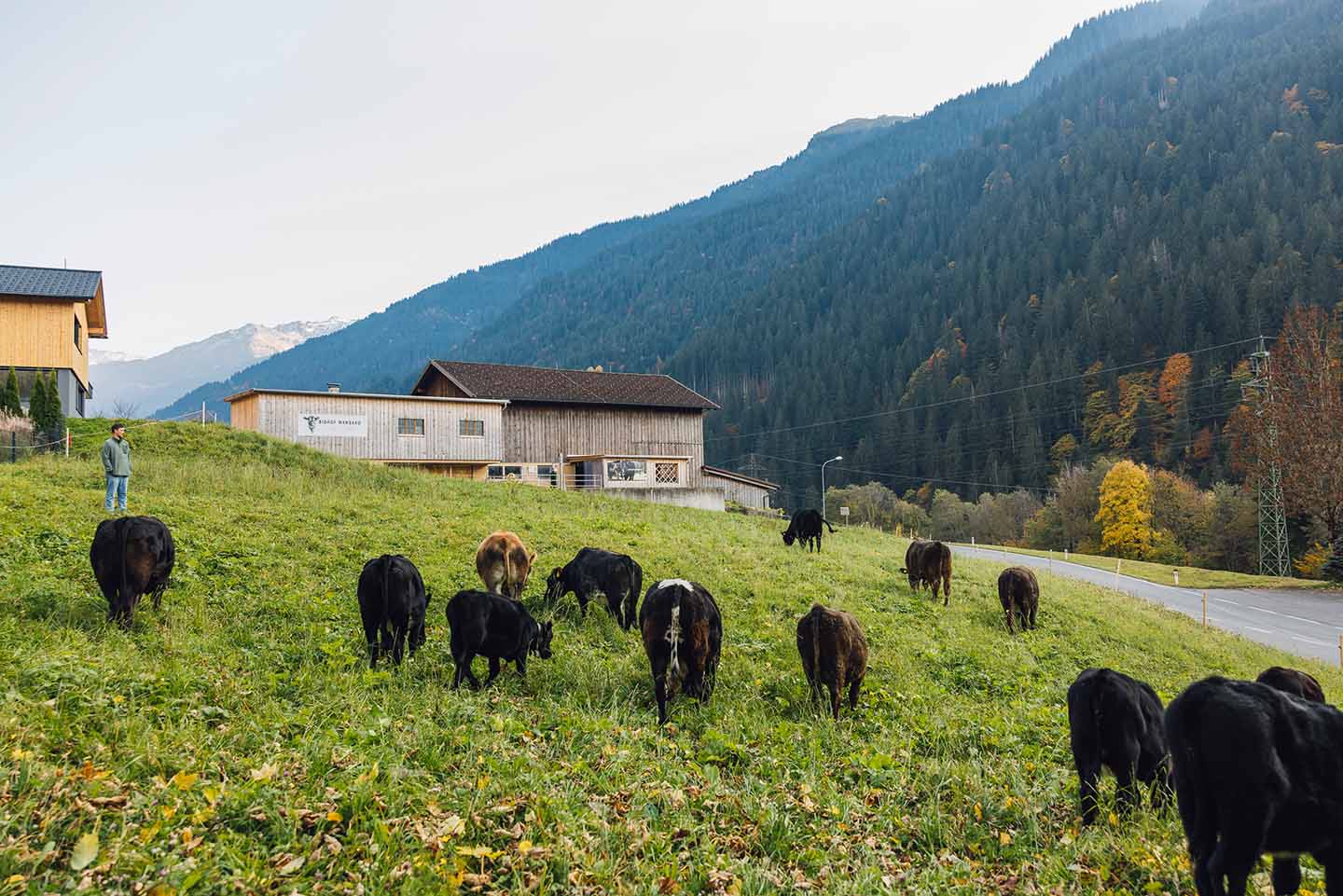 Oberhalb von 1.000 Metern gibt es kein „Sie“ mehr. In den Bergen ist man mit allem und jedem verbunden. Im Montafon geht man einen Schritt weiter und senkt die „Du-Grenze“ bis ins Tal. Unter diesem Motto setzt die Montafoner Tourismusgesellschaft auf persönliche Beziehungen. Man ist per Du mit den Menschen und auch der Natur. Am Biohof von Fabian Mangard und Victoria Boric in Gortipohl ist das nicht anders. Dort ist man – symbolisch gesprochen – auch mit den Tieren per Du. Eben ganz nah dran – und zwar vom ersten Tag an, an dem sie auf den Hof kommen. „Jedes Tier hat einen Namen und soll jenen Respekt und jene Würde bekommen, die es verdient“, ist für den 29-Jährigen ein liebevoller Umgang mit seinen Angus-Rindern eine Selbstverständlichkeit.