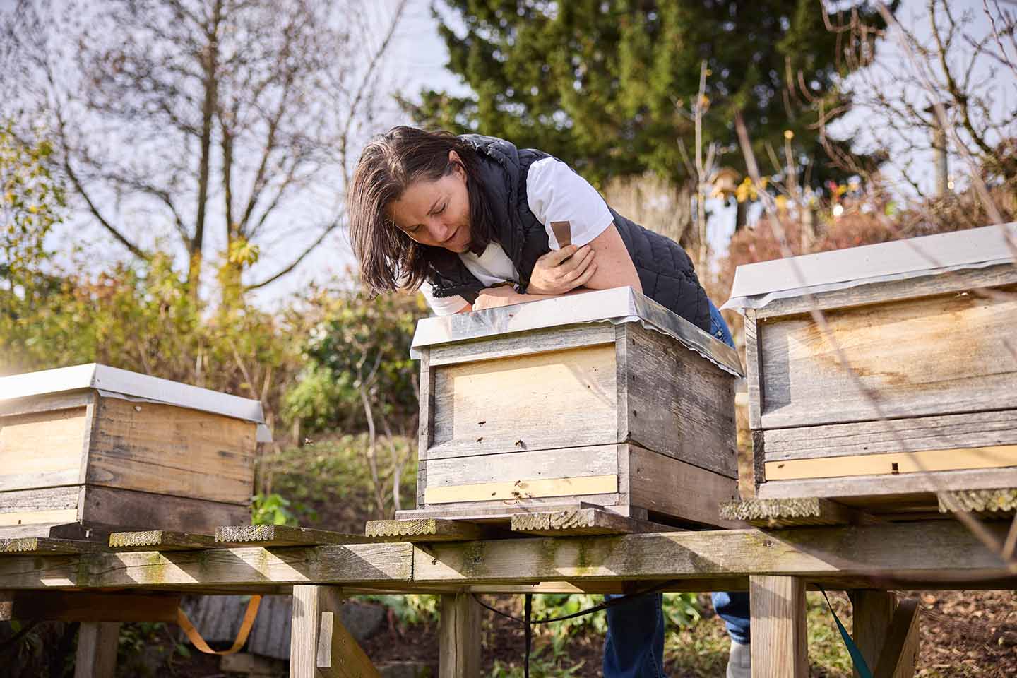 Heute betreut die 55-Jährige neben rund zwanzig Bienenvölkern auch Ziegen, Wachteln, Hühner und Hasen direkt auf ihrem Grundstück im Bregenzerwald. Dennoch verliert sie nie den Blick für das Kleine. Sie beobachtet das Flugloch, erkennt am ersten Pollenflug, ob bei den Bienen alles in Ordnung ist, und weiß, wann der Föhn die Bienen zu früh aus dem Stock lockt. „Je länger ich mit den Bienen arbeite, desto mehr Achtung habe ich vor ihnen. Sie sind Faszination pur“, sagt die Bienenreferentin. Ihre Arbeit ist geprägt von Respekt und Achtsamkeit. Dennoch ist es auch für erfahrene Imker:innen immer wieder eine Herausforderung, alle Völker durch den Winter zu bringen und die Varroamilbe fernzuhalten. Denn ohne Imker:innen würden die Honigbienen nicht überleben.