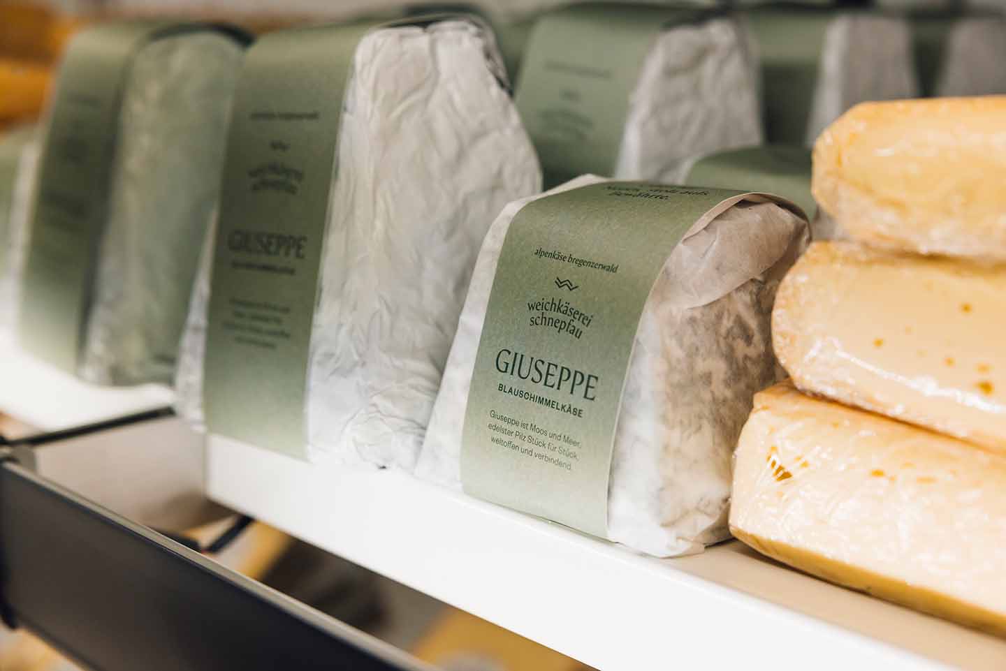 Als Pionier des Käsehandels galt dabei der älteste Bruder Leopold. Der bekannteste der drei war Gallus Moosbrugger, der ein riesiges Händlernetzwerk aufbaute. Mit einem Fuhrpark von bis zu 60 Pferden wurde der Käse bis nach Norddeutschland und Mailand exportiert. Der Familienclan verzweigte sich entsprechend und so leitete Gallus’ Sohn Josef die Geschäfte in Mailand. Er verstarb 1908 in seiner „Villa“ in Schnepfau. Doch zurück in die Gegenwart, wo „Giuseppe“ – zu Deutsch Josef – als Blauschimmelkäse im gekühlten Käsekeller still vor sich hin schimmelt. In jeder der bis dato vier erzeugten Weichkäsesorten steckt ein Stück Geschichte von anno dazumal. So gesellen sich zu Giuseppe noch die rotschmierigen Sorten Leopold (mit Blumen affiniert), Riccardo (nach dem letzten Vertreter der Mailänder Linie), der eine quadratische Form aufweist, sowie Katharina, die an den Katharinentag am 25. November erinnert, an dem die Bäuerinnen und Bauern im Voraus ihr Geld für die Wintermilch erhielten. „Es ist für jeden Geschmack etwas dabei“, fasst der gebürtige Andelsbucher Fink, der nunmehr in Schoppernau lebt, zusammen. Er hat bereits weitere Ideen, wie die Namenspalette erweitert werden könnte. „Es würde mich reizen, einen Weißschimmelkäse zu erzeugen.“