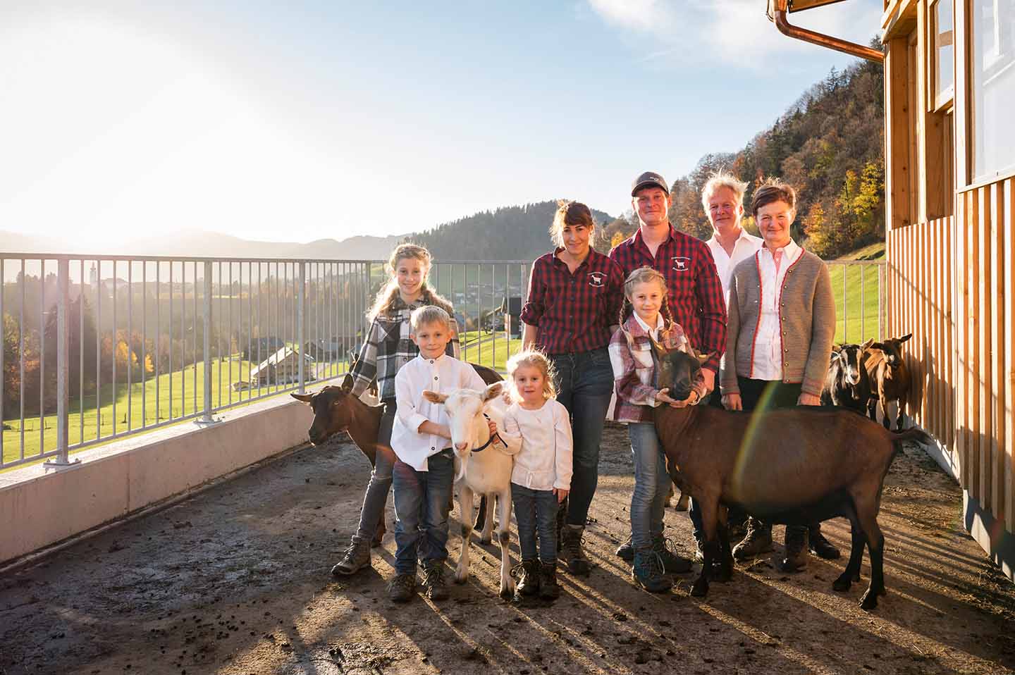 Was die Milch betrifft, sind sie dann durchaus spendierfreudiger. „Sie lieben es, wenn es trocken ist, nasse Füße mögen sie hingegen überhaupt nicht“, sagt die Magistra für Betriebswirtschaft und Gesundheitssport, die in der Landwirtschaft eine neue Berufung gefunden hat. Die Tochter des ehemaligen Spitzenskiläufers Hubert Berchtold, der einen Weltcupsieg im Riesentorlauf feierte, teilt sich die Arbeit mit ihrem Mann Christoph. Christoph, der seine Energie nicht nur zuhause in die eigene Zucht steckt, sondern sie auch als Obmann des Ziegenzuchtverbandes Bregenzerwald weiter nach außen trägt. Vor fünf Jahren übernahm das Paar den elterlichen Hof von Mina und Klaus Schwarz und führt ihn als Generationenbetrieb weiter.