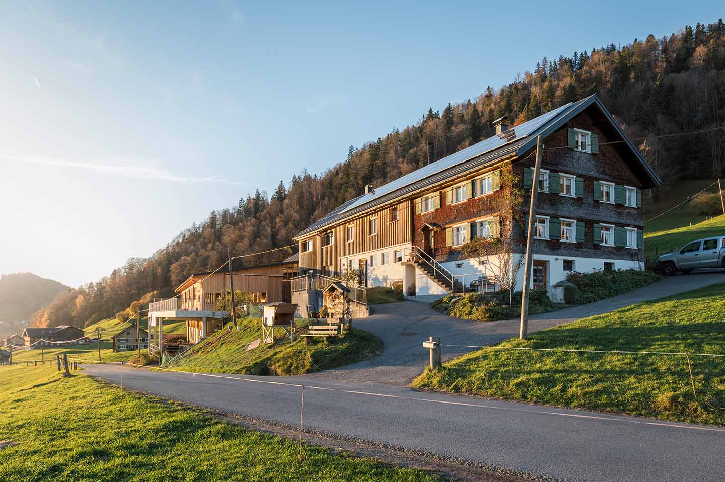 Eine klassische Work-Life-Balance kennen Kerstin und Christoph Schwarz nicht. „Die haben bei uns nur die Kühe und Ziegen“, zeigt die 41-Jährige auf den vor kurzem fertig gestellten Stallanbau mit großen Fenstern und Zugang ins Freie. Dort drinnen lassen es sich die Geißen gut gehen. Eine reibt gerade ihr Fell an der Massagebürste, andere liegen gemütlich im Stroh und dann gibt es noch solche, die einen neugierigen Blick ins Freie wagen. Denn während sich an diesem Novembertag unten im Rheintal der Nebel sammelt, scheint in Hittisau die Sonne und taucht die Natur in ein herrliches Farbenspiel aus bunt gefärbten Bäumen. Ein Traumwetter im Spätherbst, den auch die Ziegen genießen.